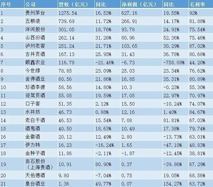 贵州茅台以1241亿元的营收、627.16亿元的净利润稳居第一。其中,茅台酒首次突破千亿元大关,其他系列酒(茅台王子酒、茅台1935酒、汉酱酒、赖茅酒)卖出30274.93吨,实现销售收入159.4亿元。