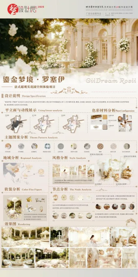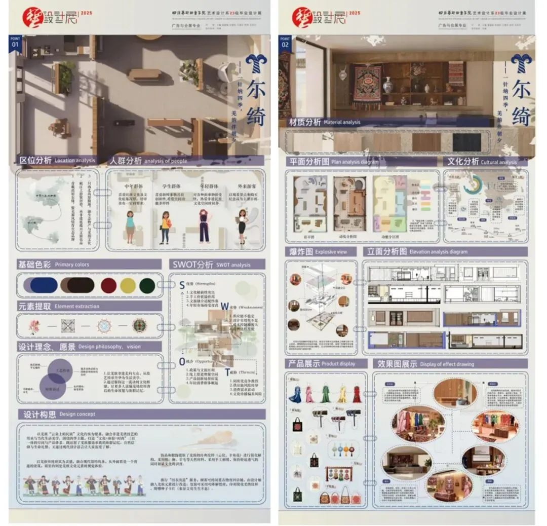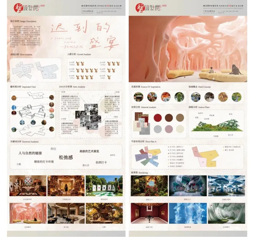 从品牌全案策划到沉浸式会展设计,从社交媒体传播到用户体验优化,每一件作品都源于对真实项目的深度拆解:或聚焦本土企业的品牌升级需求,通过AI数据分析精准定位目标客群;或依托虚拟仿真技术搭建数字化会展空间,用算法优化动线设计与交互逻辑;或借助生成式AI工具拓展视觉表达边界,在效率与创意的平衡中探索设计新范式。同学们以开放的姿态拥抱技术,却从未让工具定义创意的温度,它们不仅是对四年专业学习的成果检验,更是新一代广告与会展人面向行业交出的“能力宣言”。