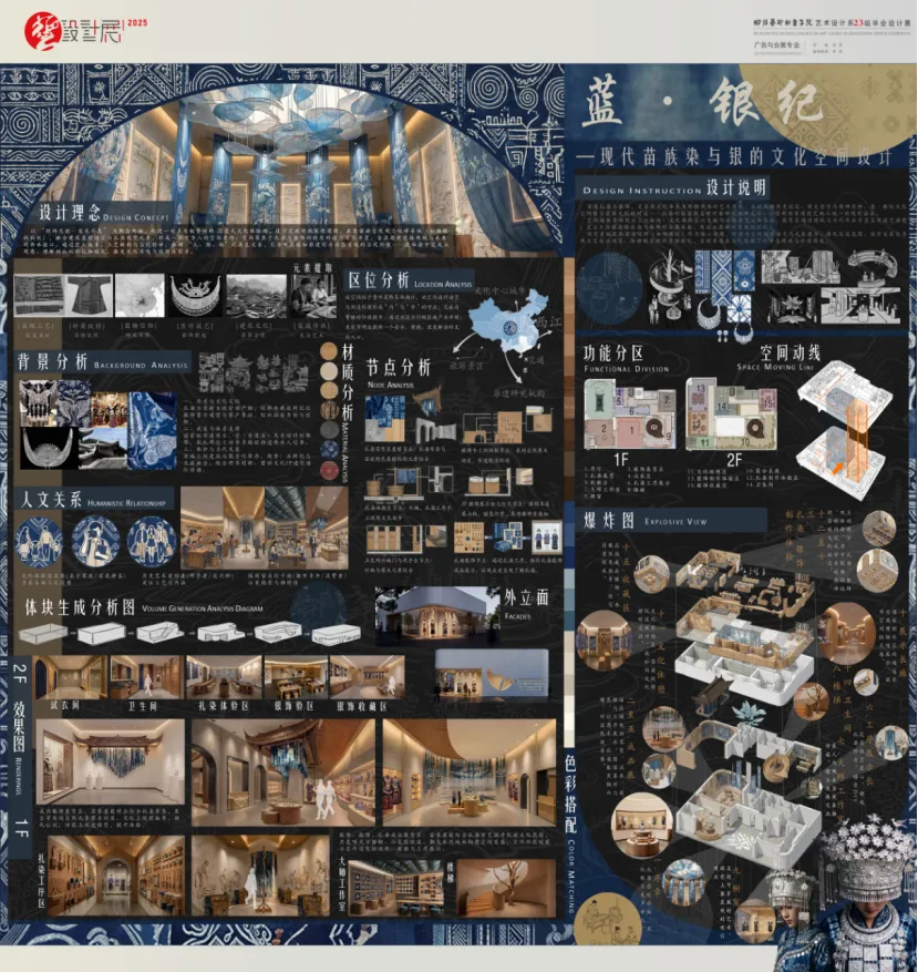 设计说明:苗族扎染与银饰承载着其文化的历史与信仰。蓝·银纪文化空间以靛蓝映银光,将两项非遗统一呈现。空间通过文化展示、古今对比与手工体验,形成从认知到实践的完整闭环,并运用苗族纹样与光影营造沉浸氛围,引导观众从观览走向实践,实现非遗的活态传承与当代再生。