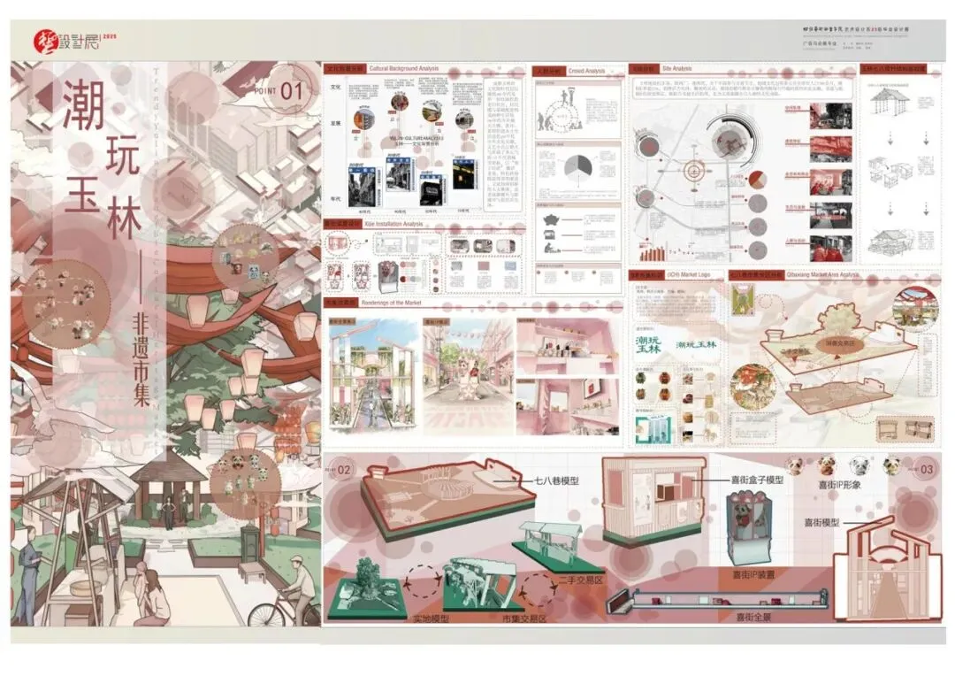 设计说明:毕业设计围绕“守正创新非遗潮活”,提取玉林非遗元素,以撞色线条重构传统肌理,融合非遗基因与现代潮流,用明快色调与潮流排版,让非遗焕发年轻活力,彰显匠心底蕴与市井潮韵。