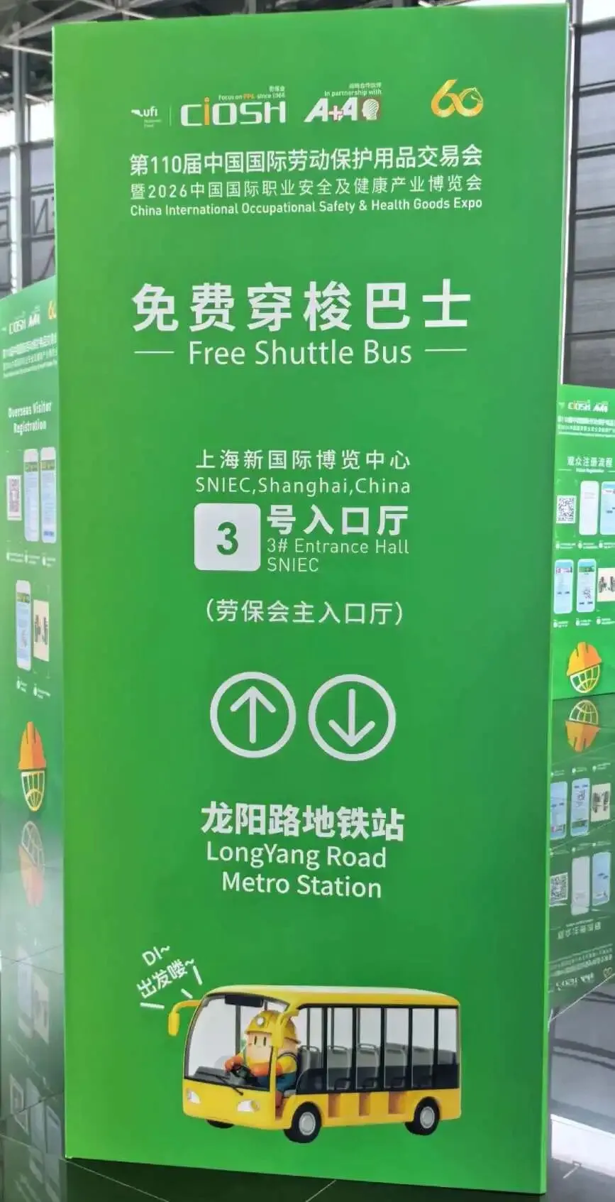 免费穿梭巴士:展会期间,龙阳路地铁站 ↔ 上海新国际博览中心 3 号入口厅(劳保会主入口厅),提供免费接驳服务,轻松直达展馆
