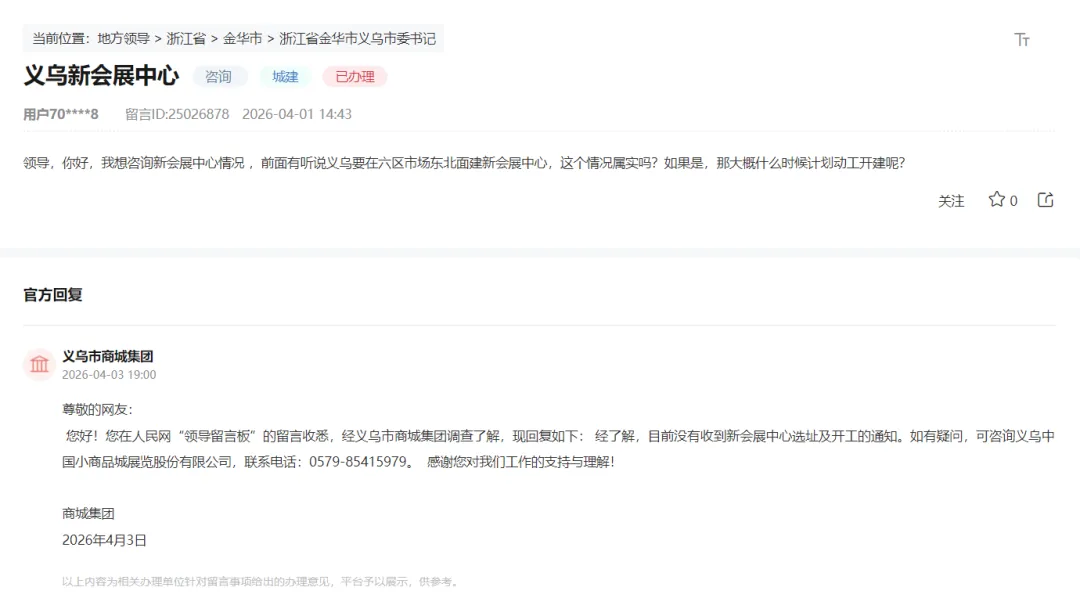 近日,有市民在网络平台咨询义乌新会展中心有关情况。咨询内容:你好,我想咨询新会展中心情况 ,前面有听说义乌要在六区市场东北面建新会展中心,这个情况属实吗?如果是,那大概什么时候计划动工开建呢?义乌市商城集团4月3日答复:经了解,目前没有收到新会展中心选址及开工的通知。如有疑问,可咨询义乌中国小商品城展览股份有限公司,联系电话:0579-85415979。 感谢您对我们工作的支持与理解!