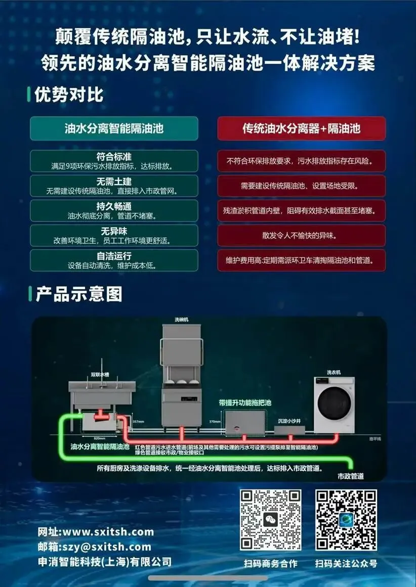 针对餐饮、酒店及商业场所普遍存在的油水分离难、施工限制大、维护负担重等问题,申消智能推出智能隔油池解决方案。与传统户外开挖建池方式不同,该方案可针对户内油水分离需求实现高效部署,无需大规模土建施工,即可完成实时排油、排水的智能化处理。