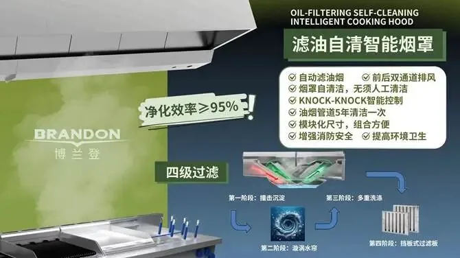 厨房油烟治理一直是餐饮行业的重要课题。传统烟罩在长期使用中容易积油,不仅清洗麻烦、维护成本高,也增加了后厨管理负担。申消智能推出的自洁烟罩采用“水与风结合”设计,油烟过滤效率可达95%,在实现高效过滤的同时,大幅减少人工清洗与维护压力。