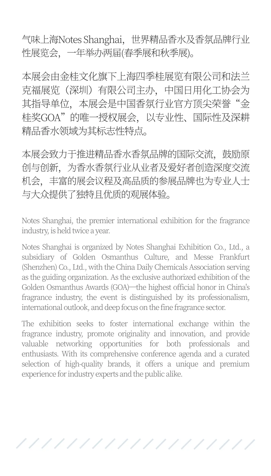 Amid a rapidly evolving industry landscape, we remain committed to a spirit of exploration and learning, striving to make Notes Shanghai a continuously evolving platform that moves forward in tandem with the entire fragrance community.