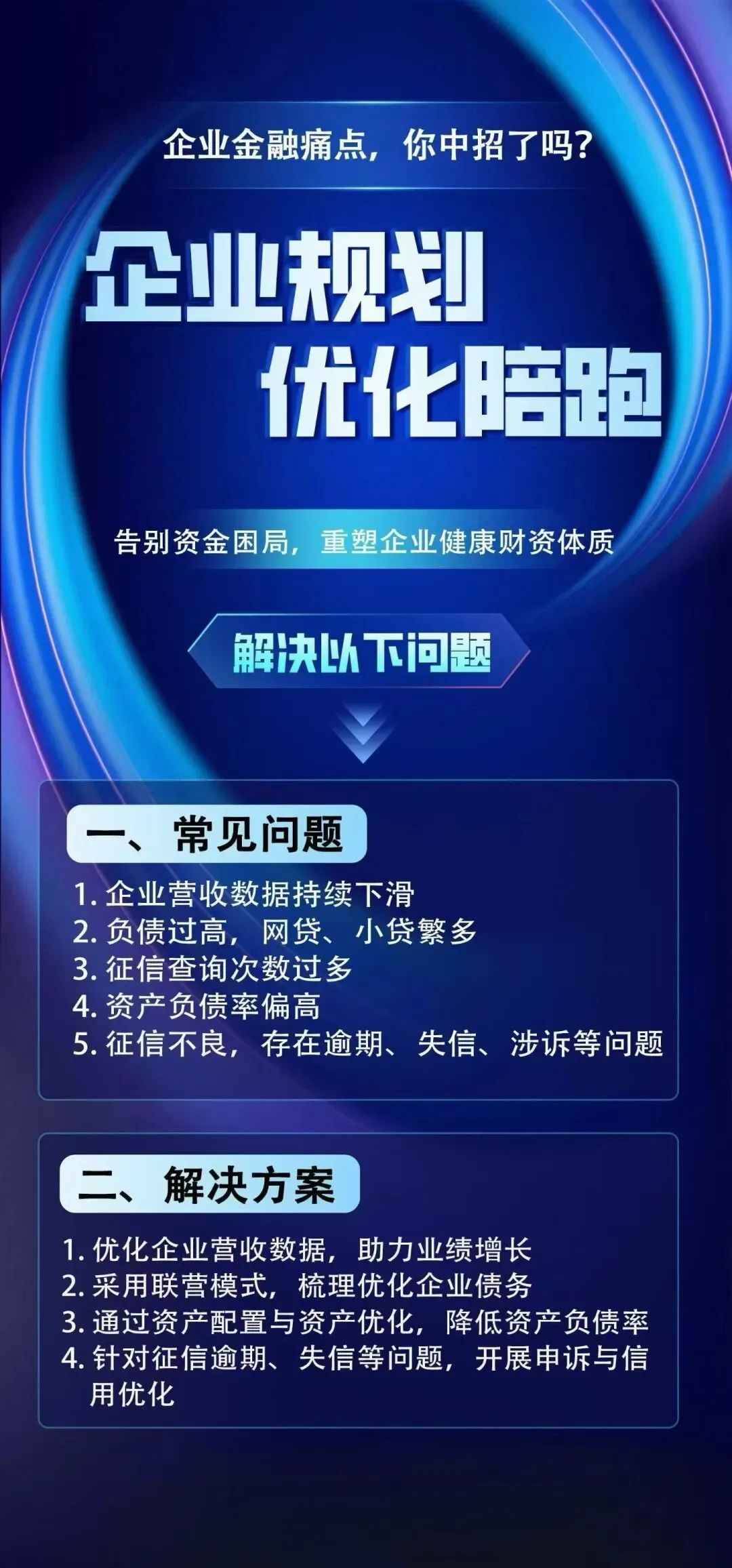 1. 全面梳理企业债务明细,制定债务重组方案,明确“低息置换高息、长期置换短期”的核心策略;