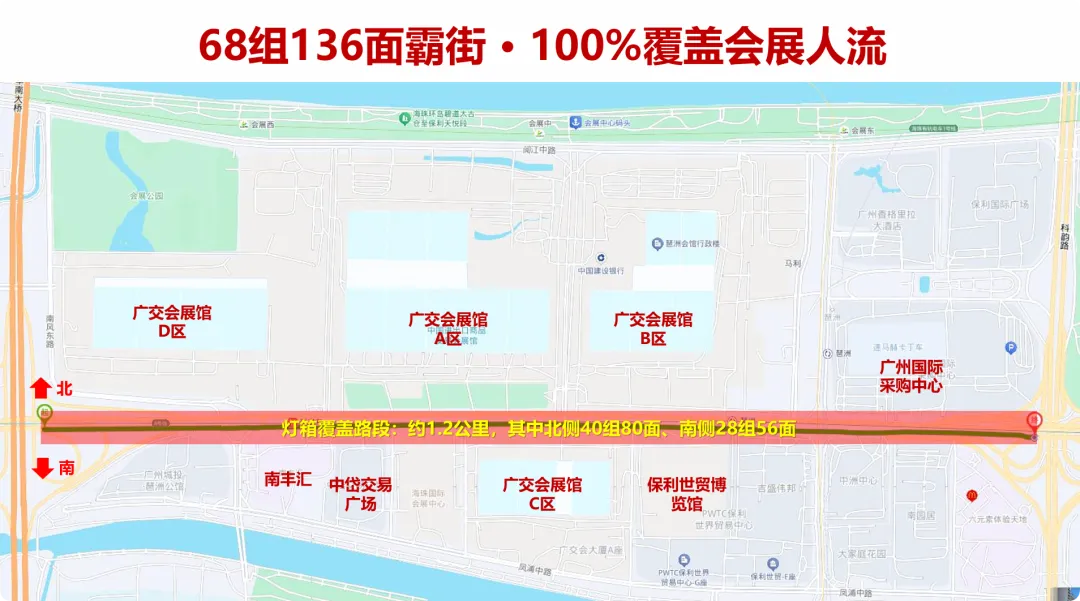 来自国内及世界各地的参展人员乘坐飞机、高铁、汽车而来 新港东路会展大道灯箱套装:霸街会展唯一主干道,99.99%触达会展人流 更是:实现品效爆发的战略级资源、赢得商机的“全球品牌符号”霸街展馆唯一主干道两侧,参展人群必经之路,形成“入口级”流量拦截品牌“先发制人”的强势曝光,直接触达潜在采购者,实现流量转化超大规模灯箱(68组136面)矩阵式视觉冲击力,强化品牌高端形象媒体规格:1.2m*1.6m=1.92m²*68组136面灯箱材质:太阳能感应式环保灯箱,亮度稳定,不受天气影响;画面为灯片材料,清晰明亮;