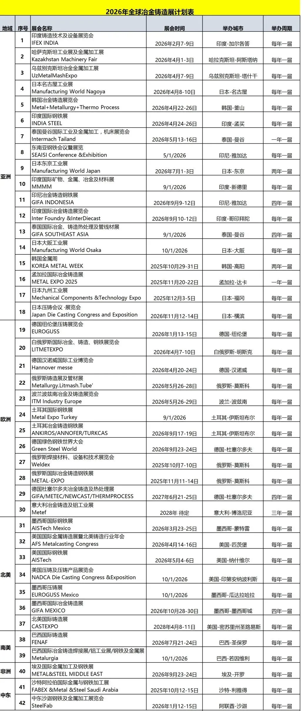 2026年"第32届俄罗斯国际冶金铸造钢铁展"将于11月10-13日在圣彼得堡Expocentre Fairgrounds举行。该展是世界上著名的冶金展之一,已成为俄罗斯境内最大的冶金钢铁工业展览会,每年举办一届,主办方为俄罗斯金属展览公司。展会包括“冶金展”和“有色金属展”有两部分,2026年扩展到所有的金属冶炼、采矿及相关原料添加辅助等相关行业,冶金铸造,铸件,管材线材,金属处理等等。2026年同时举办第18届俄罗斯国际金属加工展(18th international exhibition for steel products & structures for construction MetallStroyForum’2026和俄罗斯冶炼钢铁工业展(exhibition for equipment & technologies for steel industry & metalworking MetallurgMash’2026)。所以2026年将扩大到总共22个出展主题。