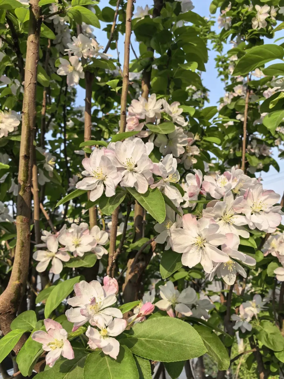 会展中心的海棠花品种繁多,色彩各异,粉的、红的、白的竞相开放,让我着实大饱眼福。花朵成团成簇地簇拥在枝头,挨挨挤挤,像是争着抢着要沐浴阳光,尽情舒展着娇嫩的花瓣,尽显蓬勃生机。