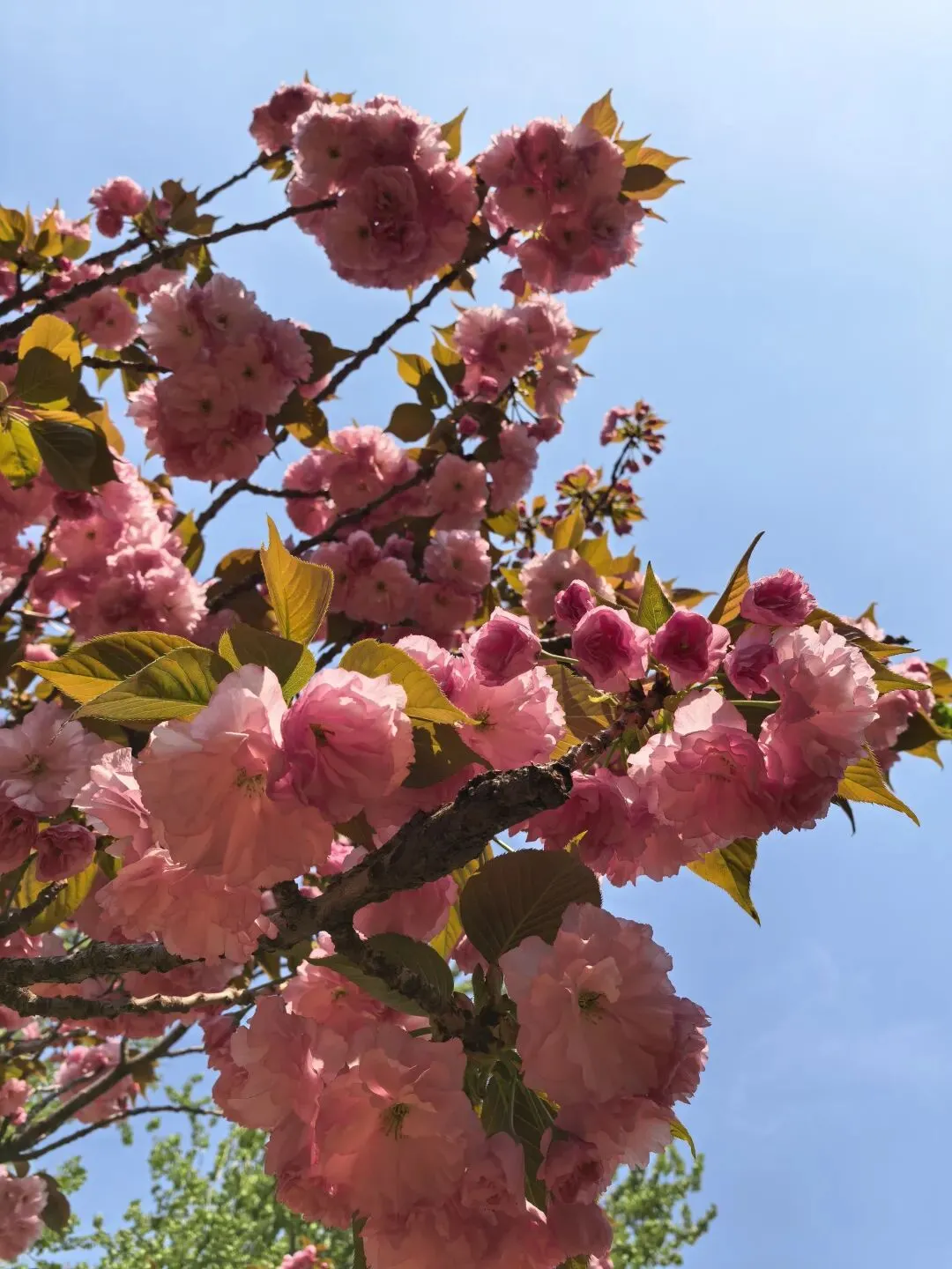 广场各处还散落着朵朵桃花,细看应是碧桃,花色比普通粉红桃花更显清丽动人,点缀在绿意之间,格外亮眼。