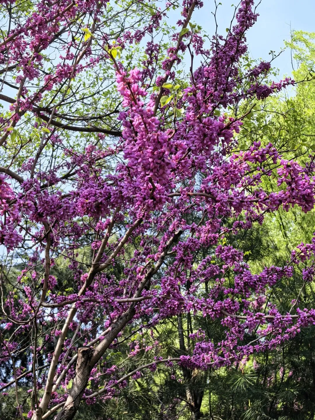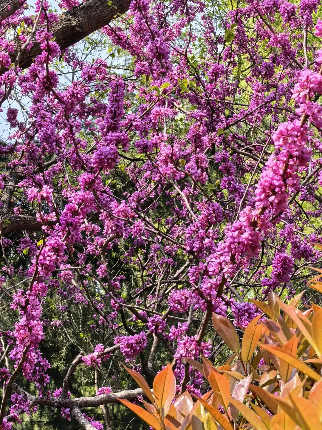紫荆花更是开得热烈肆意,此刻正是它最耀眼的时节,从树干底部到树梢,满满当当全是红艳的花朵,一串串、一簇簇缀满枝头,仿佛在向周遭的花草彰显着自己独有的明艳与不俗。