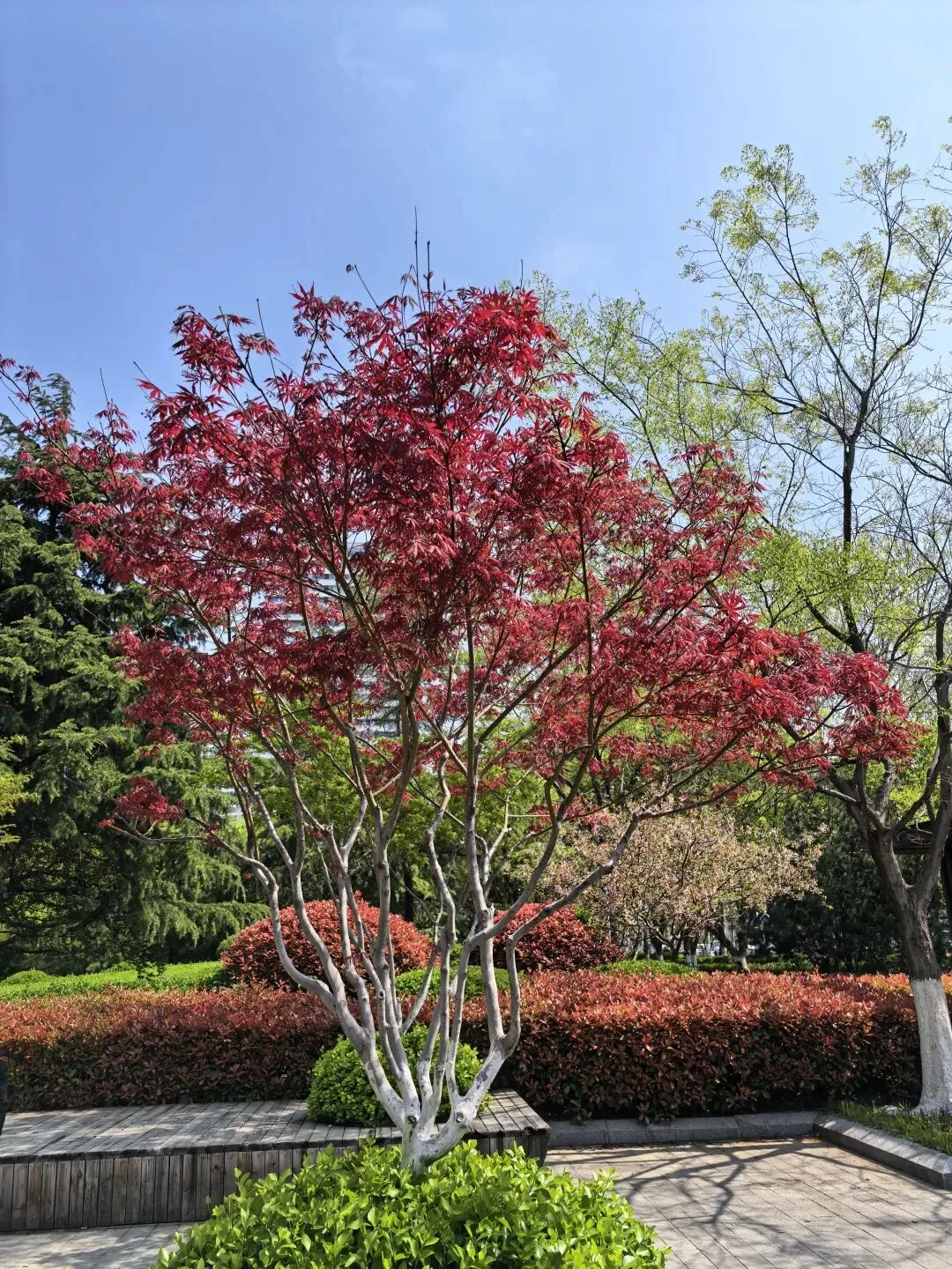 广场上还有两棵无花的树木,枝干苍劲,形态别致,即便没有繁花装点,自身也成了一道独特的风景。