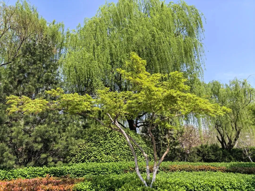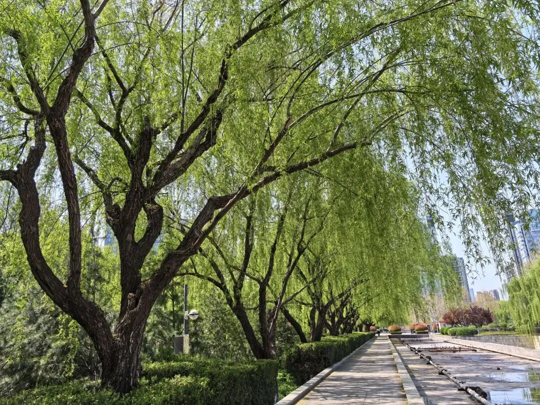 而垂柳,向来是这里最具代表性的植被,柔细的枝条垂落而下,春风拂过,枝条轻轻摇曳,身姿婀娜,伴着拂面的清风,才真正有了春风暖人、春意盎然的氛围感。