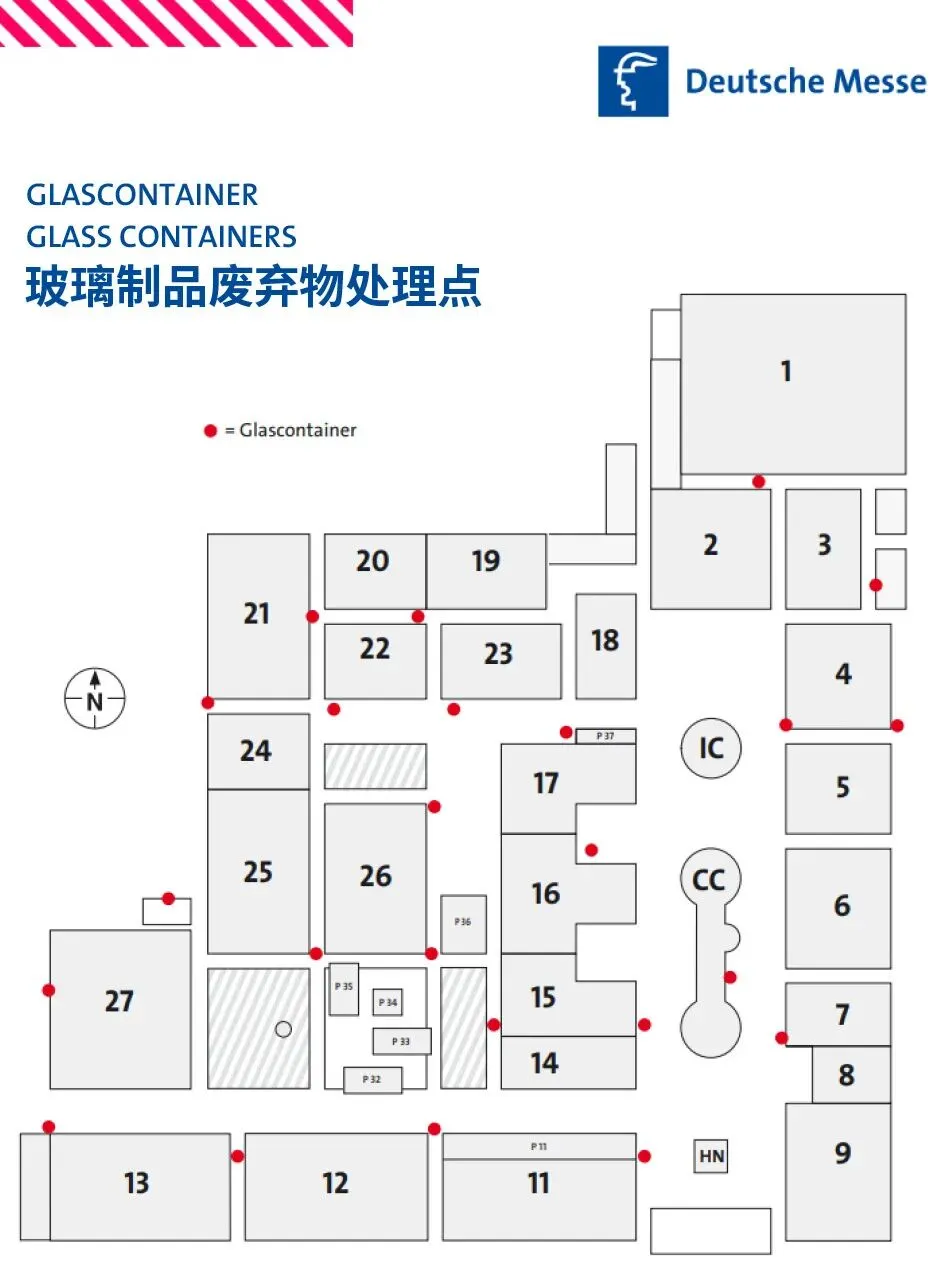 展馆周边设有专用标识的垃圾桶,用于收集少量此类特殊废弃物。您可前往展馆技术办公室查看特殊废弃物垃圾桶以及玻璃制品垃圾桶的具体分布位置。