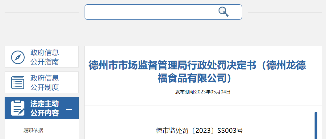 近日,山东省德州市市场监管局发布行政处罚决定书(德州龙德福食品有限公司)。