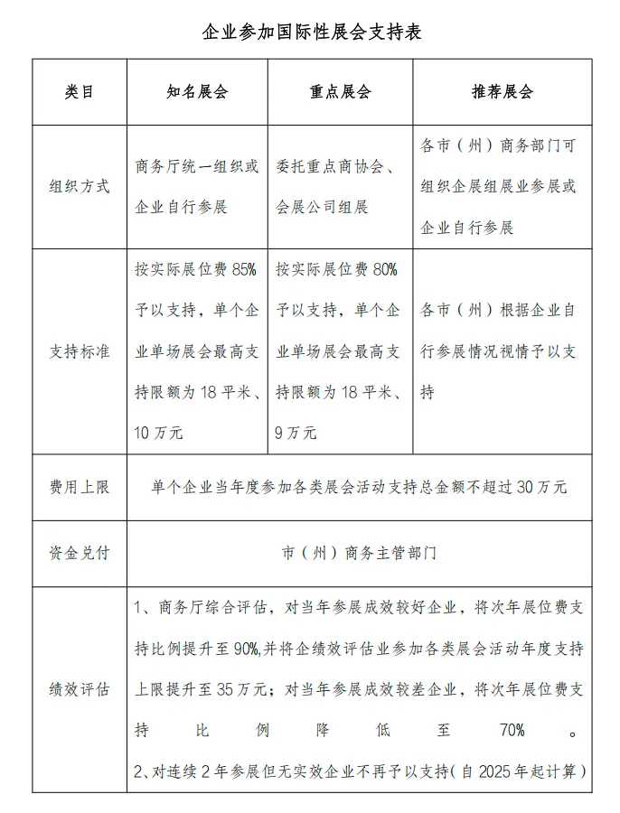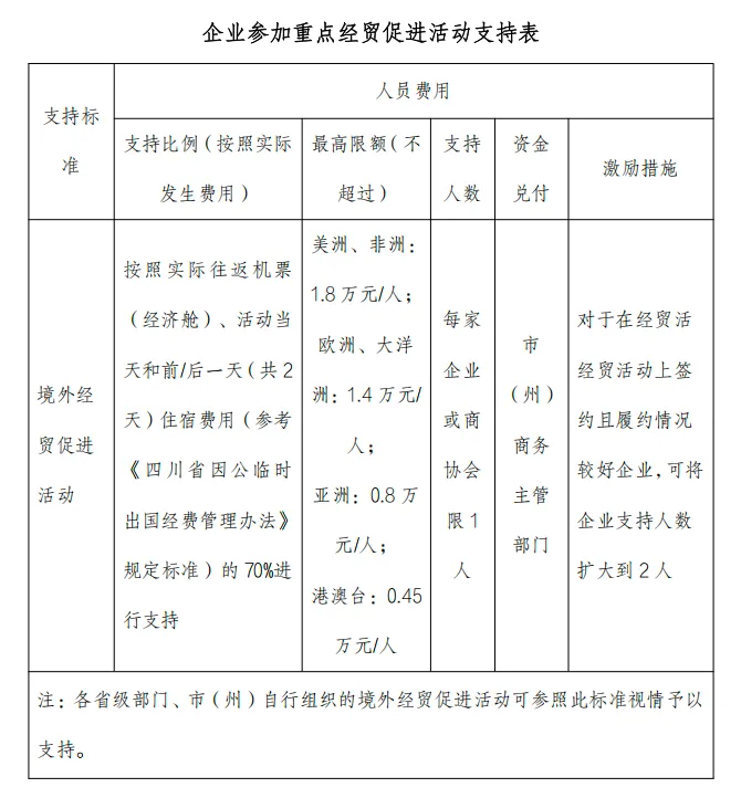 商务厅牵头在境外举行重点经贸促进活动,对经认定符合条件的企业和商协会参与人员给予相应费用支持。为确保活动成效与组织质量,原则上单个团组企业与商协会数量不超过50家。