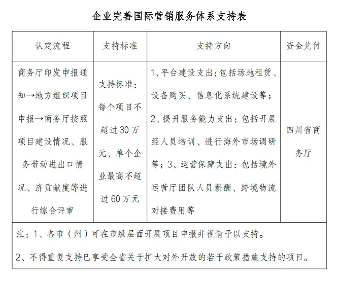 支持有条件的企业在境外建设海外仓、展示交易中心、仓储物流中心、售后服务中心、海外服务站等国际营销服务平台。每年由商务厅组织开展项目申报,对优质国际营销服务平台给予其建设或运营企业一次性资金支持。