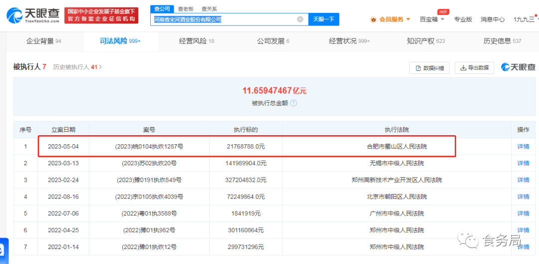 近日,河南省宋河酒业股份有限公司新增1则恢复执行信息,执行标的2176万余元,执行法院为合肥市蜀山区人民法院。目前,该公司被执行总金额已超11.6亿元。