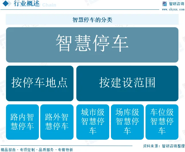 按照停车地点不同,智慧停车可以分为路内停车、路外停车两种,即是否在城市道路红线范围内提供的停车位;按照建设范围不同,可分为城市级、场库级、车位级,城市级是指城市通过物联网共享的停车设备数据,形成全城停车场“一张网”的格局;场库级主要是指不同停车场景的智慧应用;车位级主要是开发车位精细化技术应用。