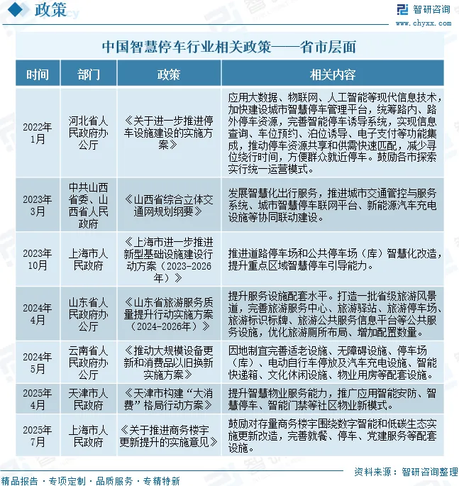 我国各省市也积极响应国家政策规划,对各省市智慧停车行业的发展做出了具体规划,支持当地智慧停车行业稳定发展。例如,2025年4月,天津市人民政府印发《天津市构建“大消费”格局行动方案》,提升智慧物业服务能力,推广应用智能安防、智慧停车、智能门禁等社区物业新模式。2025年7月,上海市人民政府印发《关于推进商务楼宇更新提升的实施意见》,鼓励对存量商务楼宇围绕数字智能和低碳生态实施更新改造,完善就餐、停车、党建服务等配套设施。
