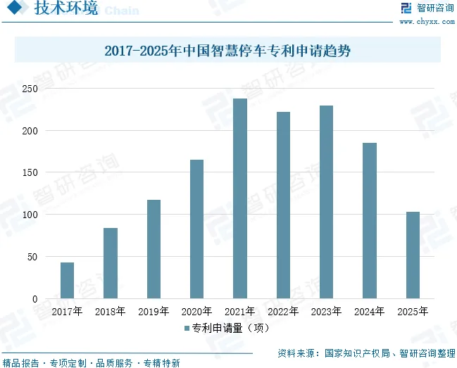 智慧停车产业的发展相当依赖各种技术的推动。无论是在数据采集层、网络通信层、数据处理层、应用服务层都离不开技术的支持。国家知识产权局数据显示,2025年“智慧停车”专利技术申请量为103项,相较2024年有所下滑。