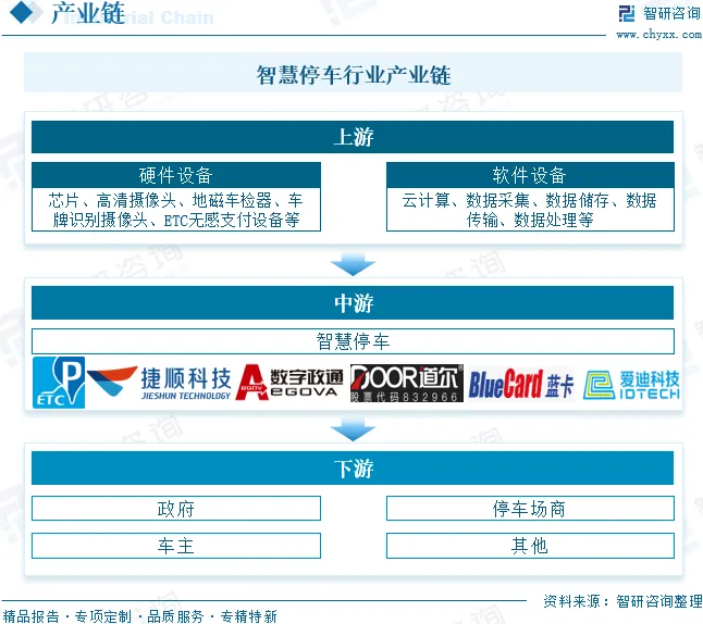 从产业链来看,智慧停车产业链上游主要包括硬件设备、软件设备供应商,其中,硬件设备主要包括芯片、高清摄像头、地磁车检器、车牌识别摄像头、ETC无感支付设备等,软件设备包括云计算、数据采集、数据储存、数据传输、数据处理等,上游企业是产业重要组成部分;智慧停车位于行业中游;行业下游为需求方,包括政府、停车场商、车主等。政府需要利用智慧停车场来解决城市停车问题,停车场商需要通过建设智慧停车场来吸引客户、提高公司利润等,对停车位有需求的车主需要更加便捷、直观的停车位使用等。