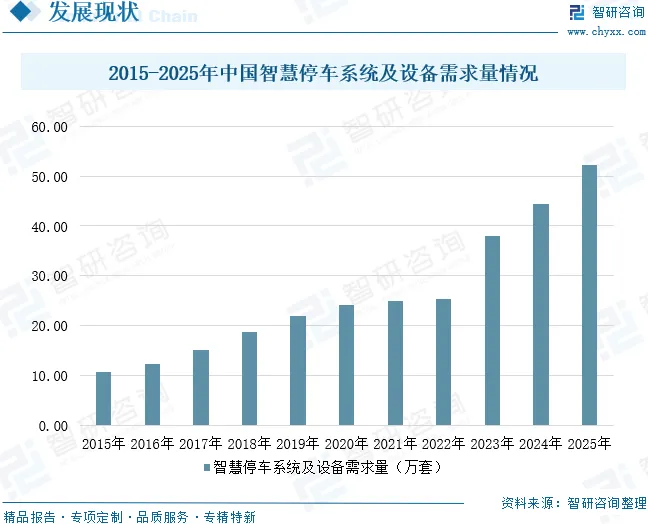 近年来,随着国内汽车消费能力及保有量水平的提高,以及房地产、城市基础设施建设等产业的快速发展,停车位数量增长远不及汽车保有量上涨速度,城市停车需求形成巨大缺口。数据显示,截至2025年9月,全国停车位与汽车的配比仅为1:0.55,按照国际通行标准,车位缺口高达1.15亿个,相当于每3辆汽车就有1辆“无家可归”。城市停车问题日益凸显,尤其在大中型城市,“停车难”已成为普遍性民生难题。在此背景下,互联网技术、物联网技术、计算机技术等高新技术的快速发展,为停车行业的转型升级提供了关键技术支撑,智慧停车应运而生并迅速崛起。通过感知设备、数据传输与智能算法的深度融合,智慧停车能够实现泊位资源的高效调度与动态定价,显著提升车位周转率与用户体验。随着智能化改造在商业综合体、交通枢纽、公共场馆等场景加速落地,我国智慧停车场系统及设备需求量持续走高。尽管2022年受产品定价较高、社区及低线城市小型停车场渗透困难等因素影响,需求量增速一度放缓,但近年来,伴随设备成本逐步优化、标准化建设推进及用户习惯加速养成,智慧停车市场重回高速增长轨道。2025年,中国智慧停车系统及设备需求量达52.12万套,同比增长17.28%,行业发展正迈入规模化扩张与深度应用并行的新阶段。