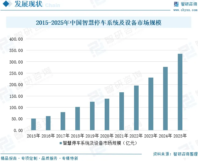 在用车群体持续扩大的背景下,我国停车场供需失衡问题日益加剧。当前停车位紧缺主要源于两大结构性矛盾:一是车位存量规模不足,难以匹配快速增长的汽车保有量;二是既有车位使用效率偏低,大量泊位存在时段性闲置与潮汐式拥挤并存的现象。因此,缓解停车难题单靠增量建设远远不够,必须同步推动存量利用效率的提升。智慧停车凭借其资源统筹、动态调度、无感通行与数据互联等核心能力,成为破解停车难的最佳技术路径,并在智慧城市建设体系中占据日益重要的战略地位。近年来,得益于社会资本的高度关注与密集布局,智慧停车系统及设备行业迎来快速发展期,市场需求持续释放,行业规模加速扩张。据统计,中国智慧停车系统及设备行业市场规模从2015年的51.2亿元增长至2025年的334.48亿元,年复合增长率为20.65%。城市停车位缺口巨大,为智慧停车行业提供了广阔的市场空间。