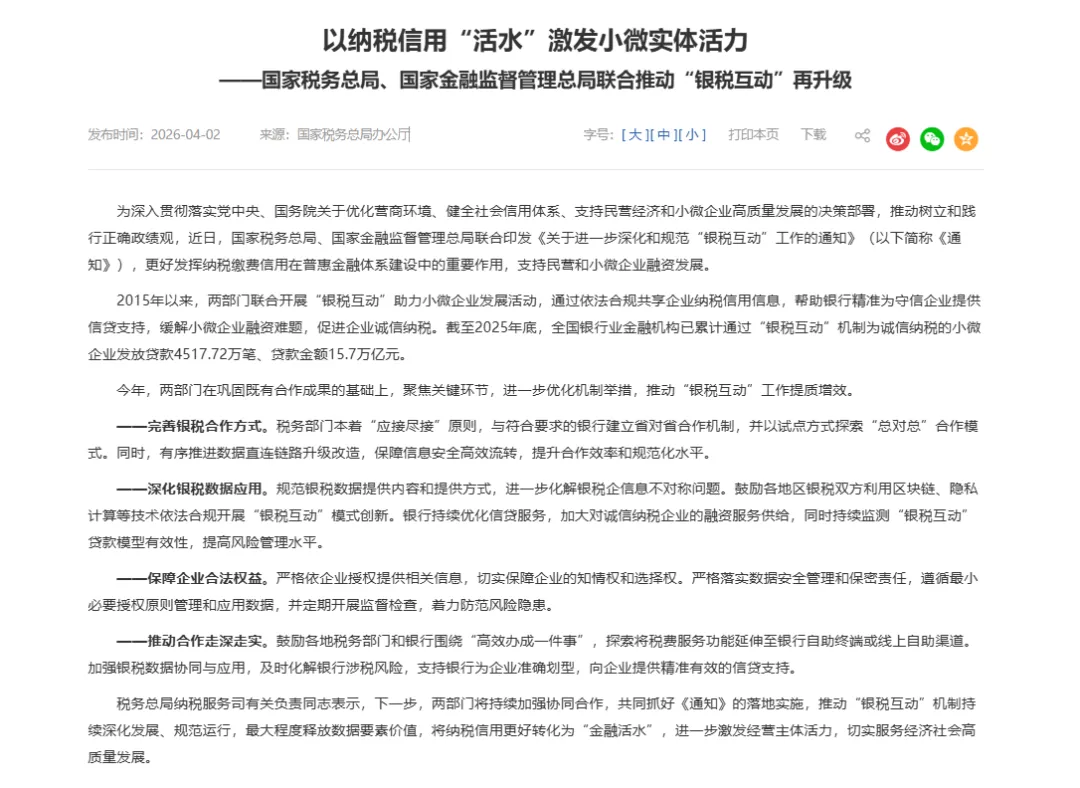 4月2日,国家税务总局与金融监管总局联合发布重磅通知:“银税互动”全面升级! 以后,诚信纳税的小微企业,贷款不再求人,流程快得像点外卖,而且你的商业秘密,国家用黑科技帮你守住了!
