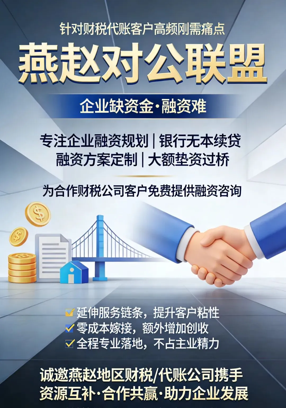针对财税代账客户的这一高频刚需痛点,燕赵对公联盟正式发起合作邀约,以专业融资服务为纽带,与燕赵地区所有财税、代账公司携手,打破服务边界,实现合作共赢!