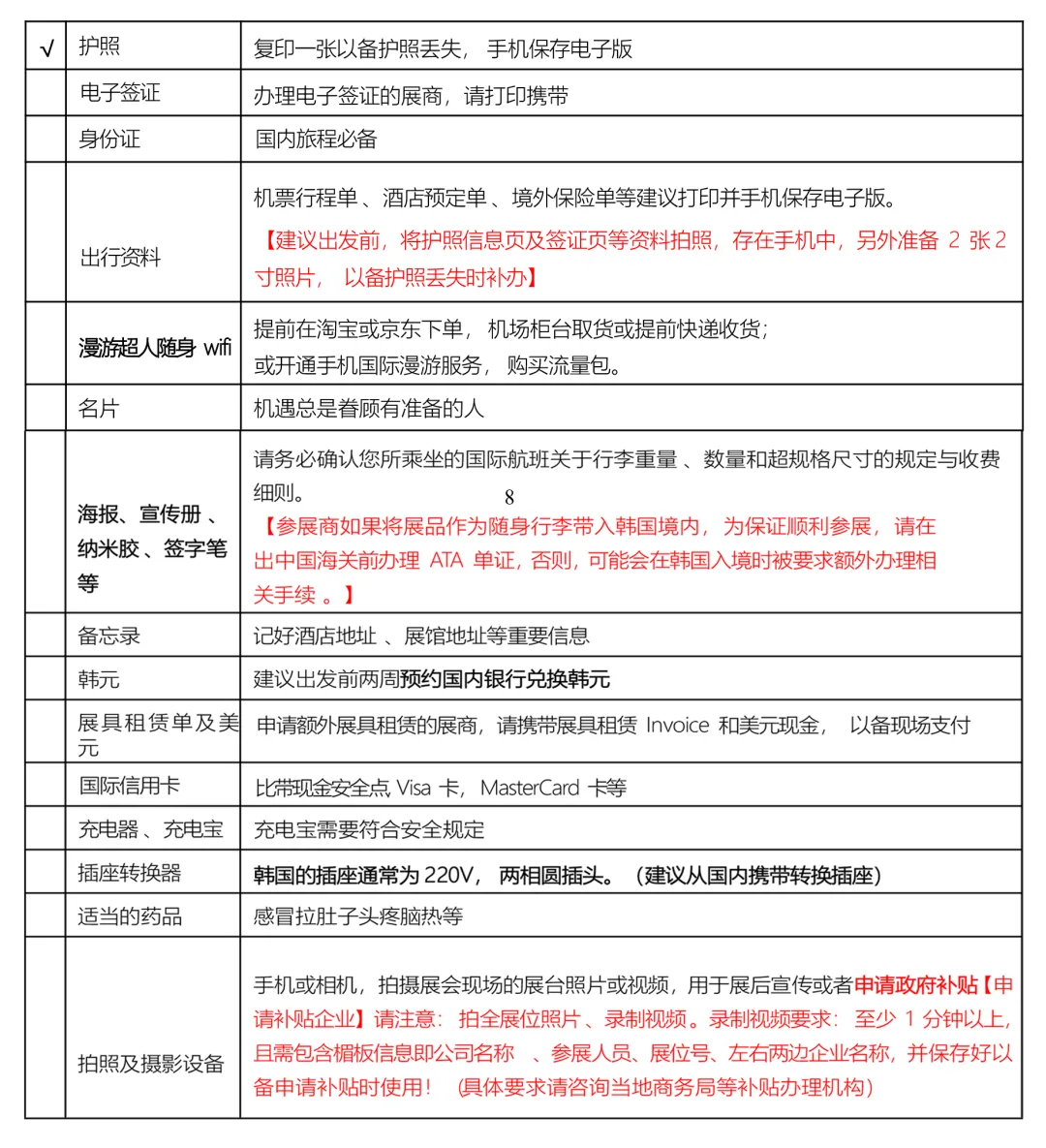 出国临行前的行李检查表