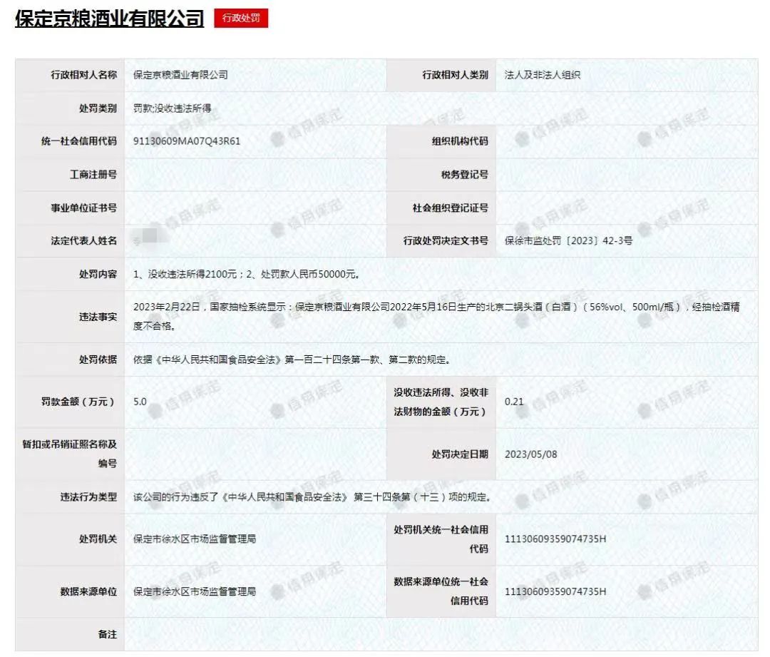 违法事实:2023年2月22日,国家抽检系统显示:保定京粮酒业有限公司2022年5月16日生产的北京二锅头酒(白酒)(56%vol、500ml/瓶),经抽检酒精度不合格。