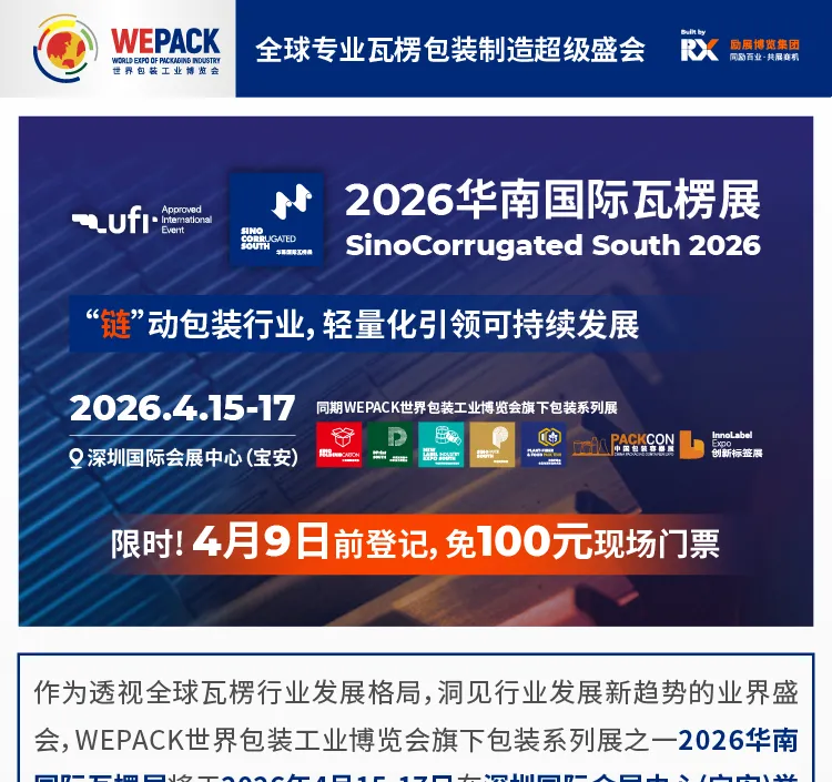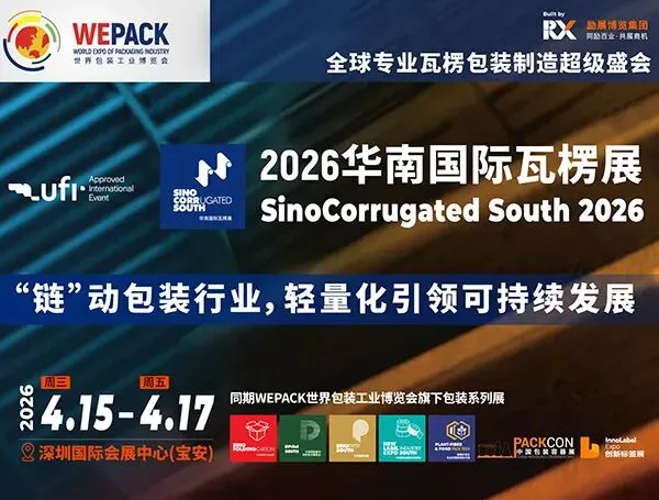 2026华南国际瓦楞展将于2026年4月15-17日在深圳国际会展中心(宝安)举办。作为WEPACK世界包装工业博览会旗下包装系列展之一,八大包装产业品牌展会同期举办,规模达12万平方米,成为2026年全球包装行业的超大型盛事。展会充分发挥产业链协同优势,为您提供一个提升品牌知名度、开拓全球市场、拓展行业人脉,了解行业资讯、洞悉市场未来方向的综合性商贸展示平台。