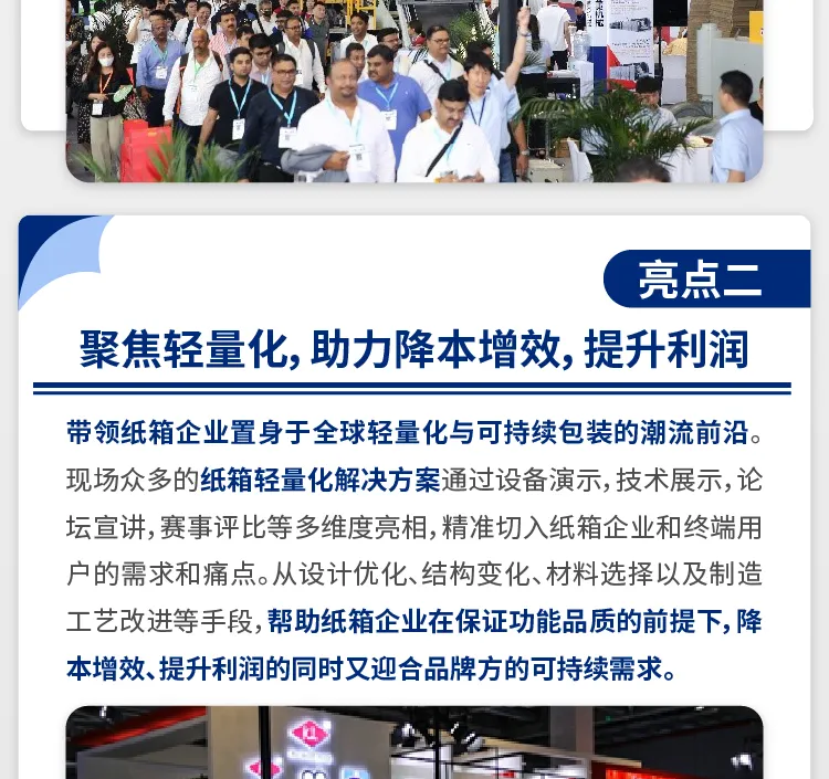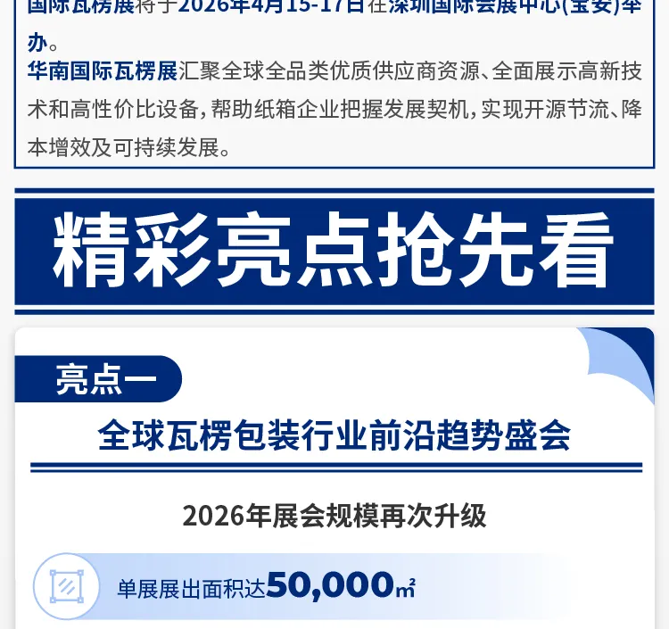 华南国际瓦楞展拥有二十余年的历史积累和品牌沉淀,是纸箱企业了解全球瓦楞纸板、纸箱加工制造领域的前沿资讯和先端技术以及先进生产经营理念的专业盛会。2026华南国际瓦楞展将汇聚海内外知名供应商品牌,集中呈现千台高端和高性价比设备以及千余种耗材,精彩展现纸箱制造在智能化、数字化、高效化、节能化、绿色化方面的技术与趋势。
