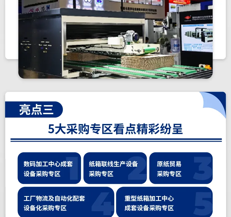 纸板加工设备及零配件、 纸箱加工设备及零配件 、纸箱加工各类工业用纸、 纸板 / 纸箱加工相关耗材、 纸箱加工软件 / 自动化类、 纸箱加工服务类、 厂房配套设备类 、内部物流输送系统、 蜂窝 / 纸浆模塑设备、 检测仪器