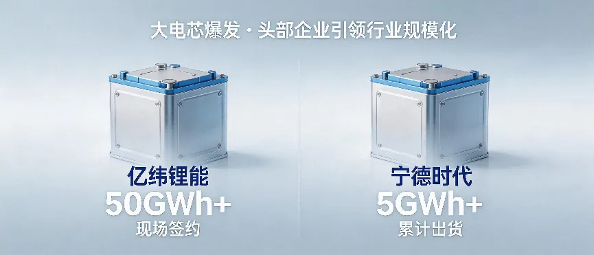 大电芯赛道迎来爆发式增长,成为本次展会最亮眼的看点之一。头部企业捷报频传,亿纬锂能在展会现场大放异彩,全球首发Mr.Big Family系列6.9MWh储能大电池系统,同时与金风零碳、晶科储能、林洋能源等5家行业头部企业集中签署战略合作协议,累计签约规模超50GWh,用实打实的订单印证了市场对其大电芯技术与解决方案的高度认可。与此同时,宁德时代的表现同样亮眼,其587Ah大容量储能电芯累计出货量正式突破5GWh,该电芯由山东济宁“灯塔工厂+零碳工厂”量产支撑,单日产能超22万支,缺陷率控制在PPB级别,已广泛应用于内蒙古包头卜尔汉图、宁夏宁东等国家级标杆储能项目,相较于传统方案可减少40%零部件,大幅降低建设与运维成本,规模化应用成效显著。两大龙头的强势表现,标志着大电芯已成为储能市场的主流选择,行业规模化发展势头不可阻挡。