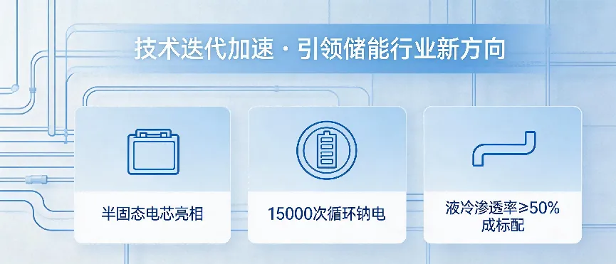技术迭代持续加速,多项前沿技术首次亮相,引领储能行业迈入高质量发展新阶段。展会现场,半固态储能电芯、循环寿命达15000次的储能专用钠电同步登场,成为技术升级的核心亮点。其中宁德时代展出的储能专用钠离子电池,与现有587Ah锂电池采用同壳体平台化设计,可实现系统兼容,电池容量达300+Ah,能量转换效率97%,可全面覆盖2小时到8小时的大型储能及AIDC储能应用场景,且计划于年内实现商业化落地,其高安全、低成本、优低温的特性,将进一步丰富储能场景适配性。更值得关注的是,液冷系统渗透率已突破50%,正式成为行业标配。依托高比热容的液体介质,液冷系统可将电芯温差控制在3℃以内,精准控温、遏制热失控风险,同时具备毫秒级响应速度,能平抑电网波动,适配高功率密度储能系统的需求,再加上国家容量电价机制落地等政策加持,液冷系统的普及速度将进一步加快,成为储能系统安全高效运行的“生命线”。