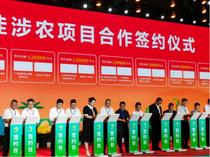 会上,黄如龙代表钦北区人民政府与广西田野农业集团有限公司现场签约钦州钦北区现代农业产业园建设项目。据悉,该项目投资人民币12亿元,拟选址在钦北区平吉镇九佰垌农业公园,规划用地面积24800亩。项目建成投产后,预计年产值8亿元人民币以上,提供就业岗位500个以上。该项目的签约落户将进一步壮大九佰垌农业公园园区产业规模,促进乡村振兴,助推钦北区县域经济高质量发展。