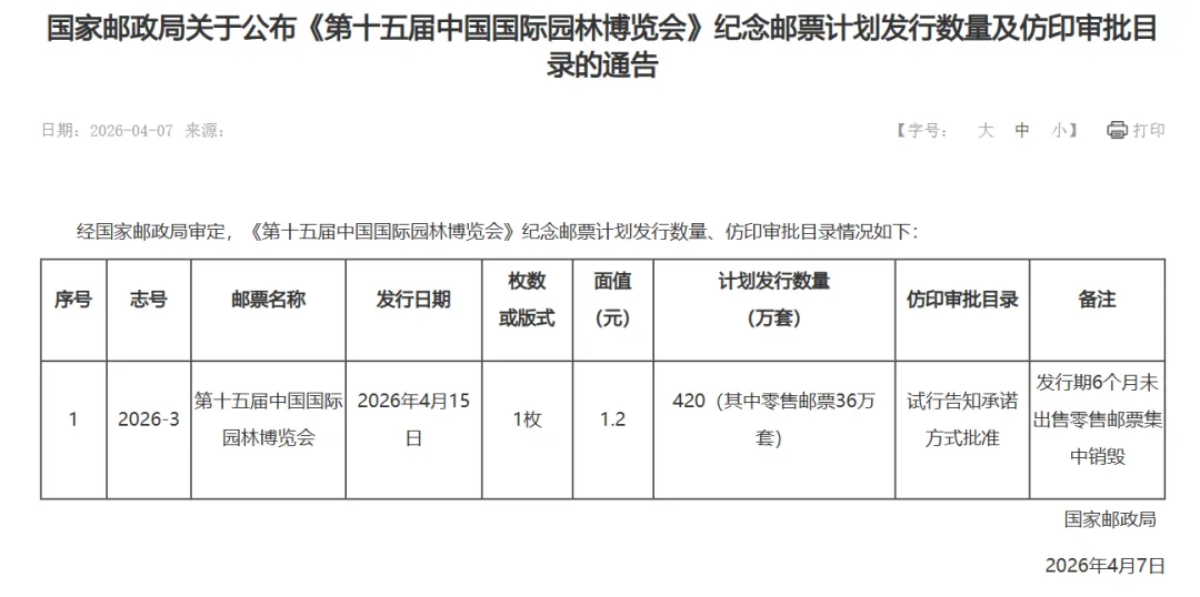 国家邮政局关于公布《第十五届中国国际园林博览会》纪念邮票计划发行数量及仿印审批目录的通告。