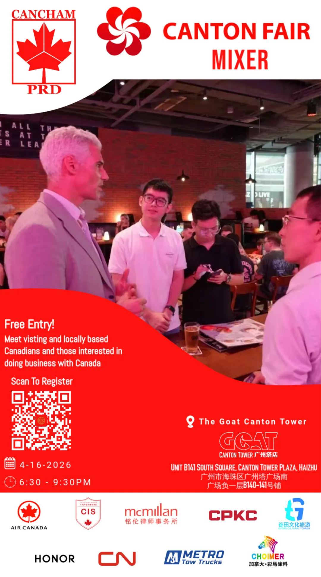 无论您是来参加广交会,还是常驻本地,这都是一个与加拿大及国际商务社群建立联系的绝佳机会。期待与您相见!