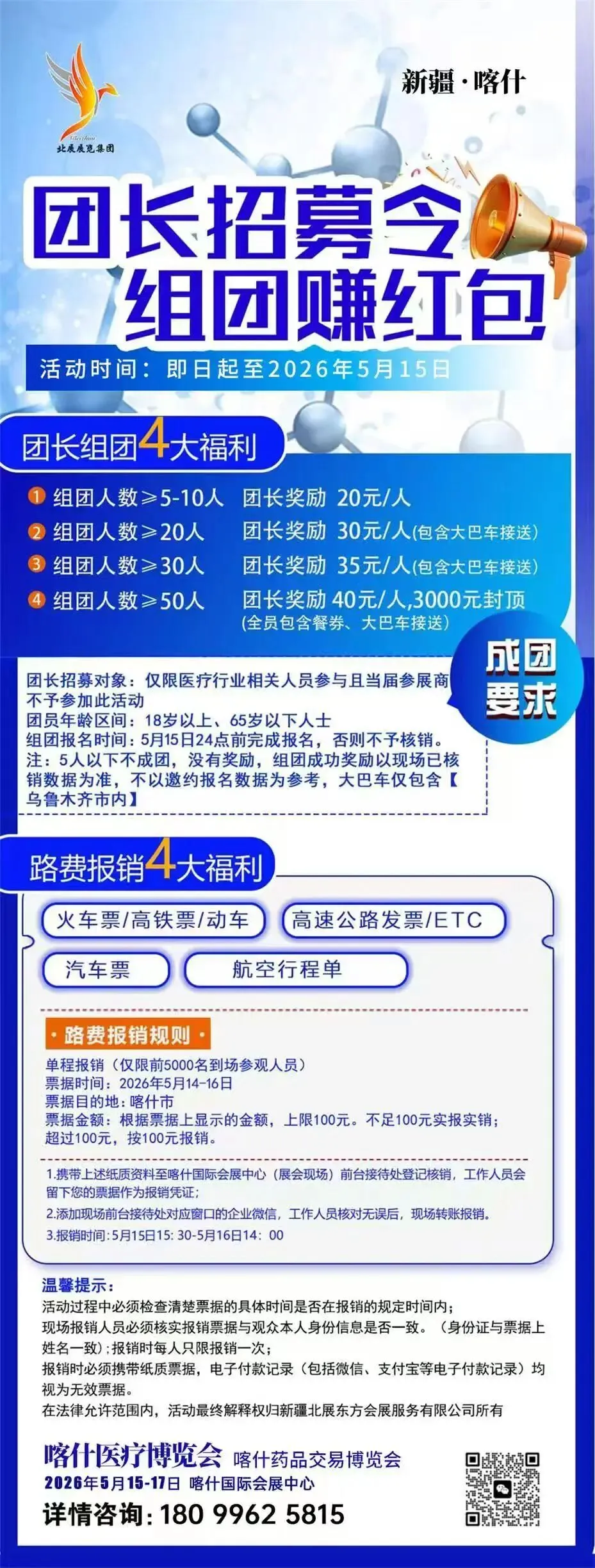 团长招募拉满5人即可成团,团长享20-40元/人阶梯奖励,50人团最高3000元福利,喀什市内享大巴接送与全员餐券。前5000名到场观众可报销5.14-16赴喀什单程路费,最高100元,多种票据均可申报。