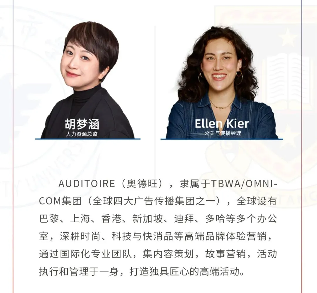 4月2日,AUDITOIRE的人力资源总监胡梦涵、公关与传播经理Ellen Kier受邀来到新西兰UW学院,开展“Crafting Culture and Capturing Events from Paris to Shanghai”专题讲座,为同学们解读国际品牌活动背后的匠心与创意,探讨文化会展与创意营销的前沿趋势。