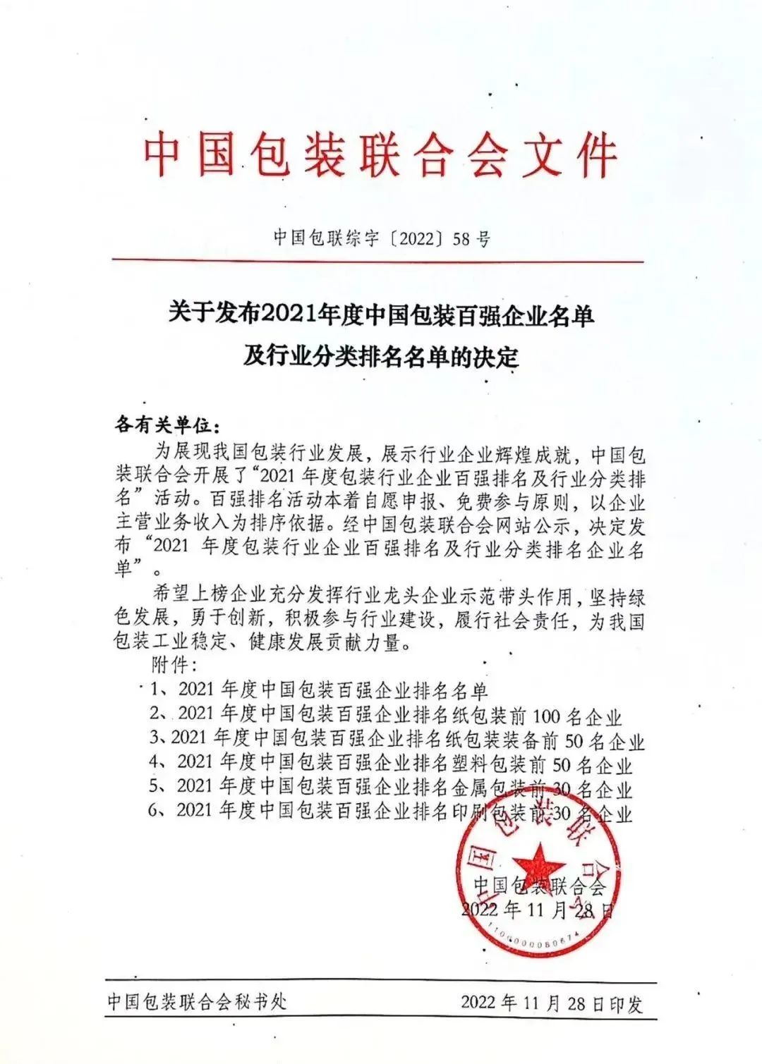 为展现我国包装行业发展,展示行业企业辉煌成就,2022年12月,中国包装联合会开展了“2021年度包装行业企业百强排名及行业分类排名活动”,作为包装行业最大的分类,纸包装在全球包装行业中占据了相当大的比重,在此次包装行业企业百强排名及行业分类排名活动中,亦为纸包装前100名企业进行了评选排名。