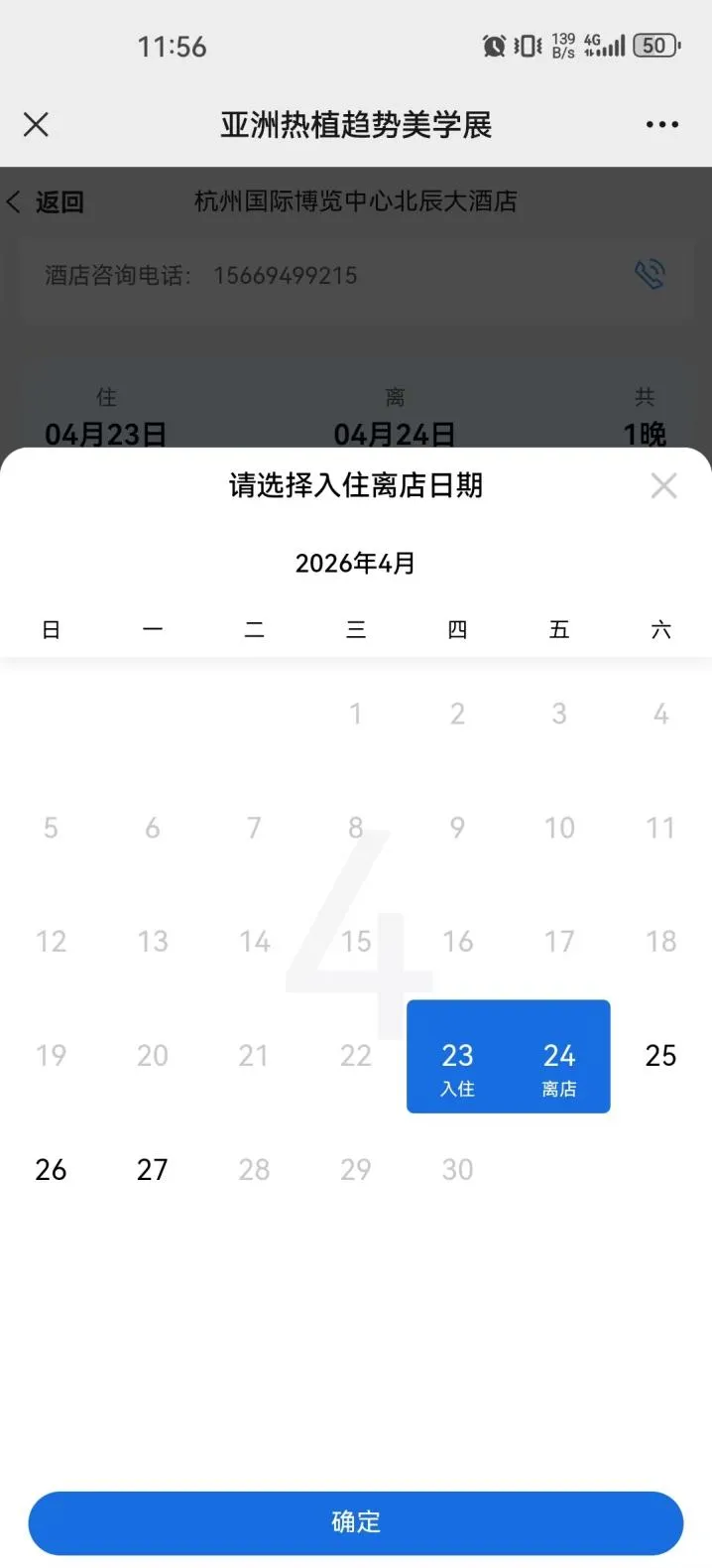 3. 点击蓝色的【预订】按钮,底部会再次弹出入住日期确认框。请核对入住日期和离店日期。如不正确,重新选择日期;如入住日期没有问题,则点击【确定】按钮进入下一步房型确认。