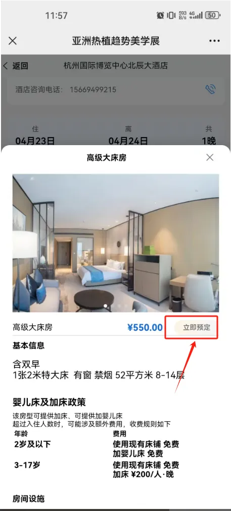 4. 进入房型确认页面,核对无误后,点击【立即预定】按钮