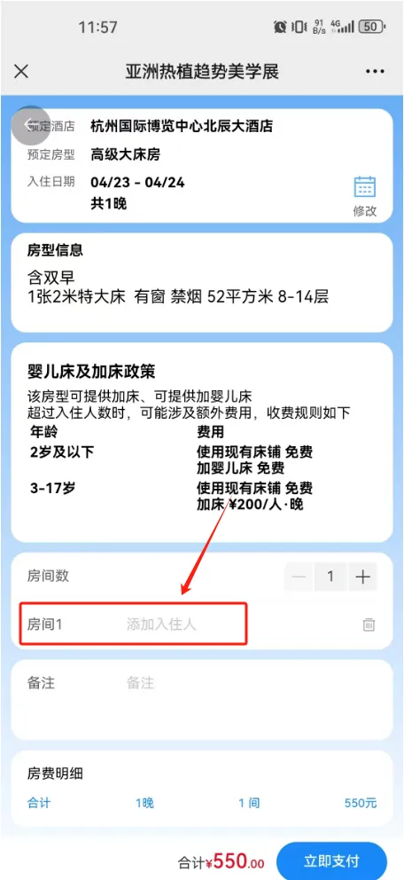 6. 登录成功后,系统会跳转到填写入住人信息的页面。请点击 “房间1 添加入住人”。