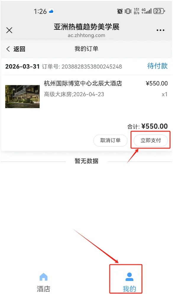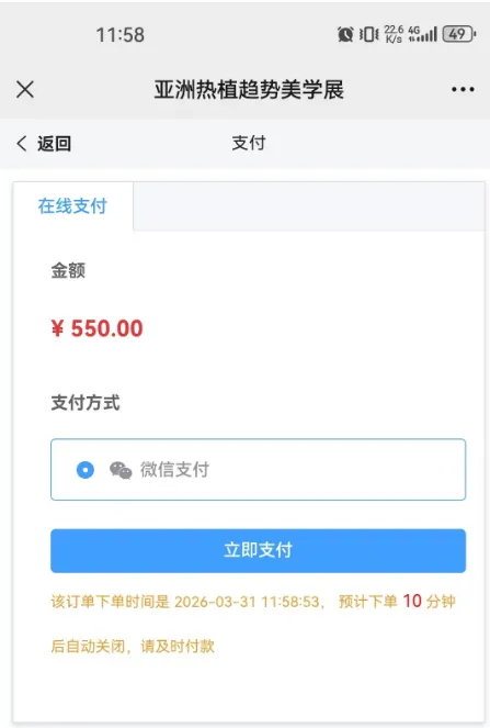 7. 请选择支付方式并点击【立即支付】按钮进行支付。支付订单可点击页面底部导航菜单【我的】查看订单状态。【待付款】的订单,也可以在我的订单页面点击【立即支付】重新发起支付。