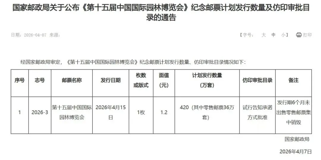 《第十五届中国园林博览会》邮票计划发行量420万套,其中零售邮票36万套。