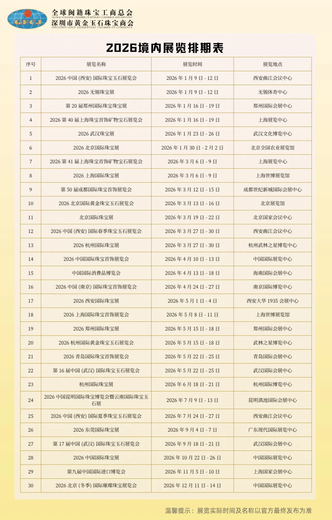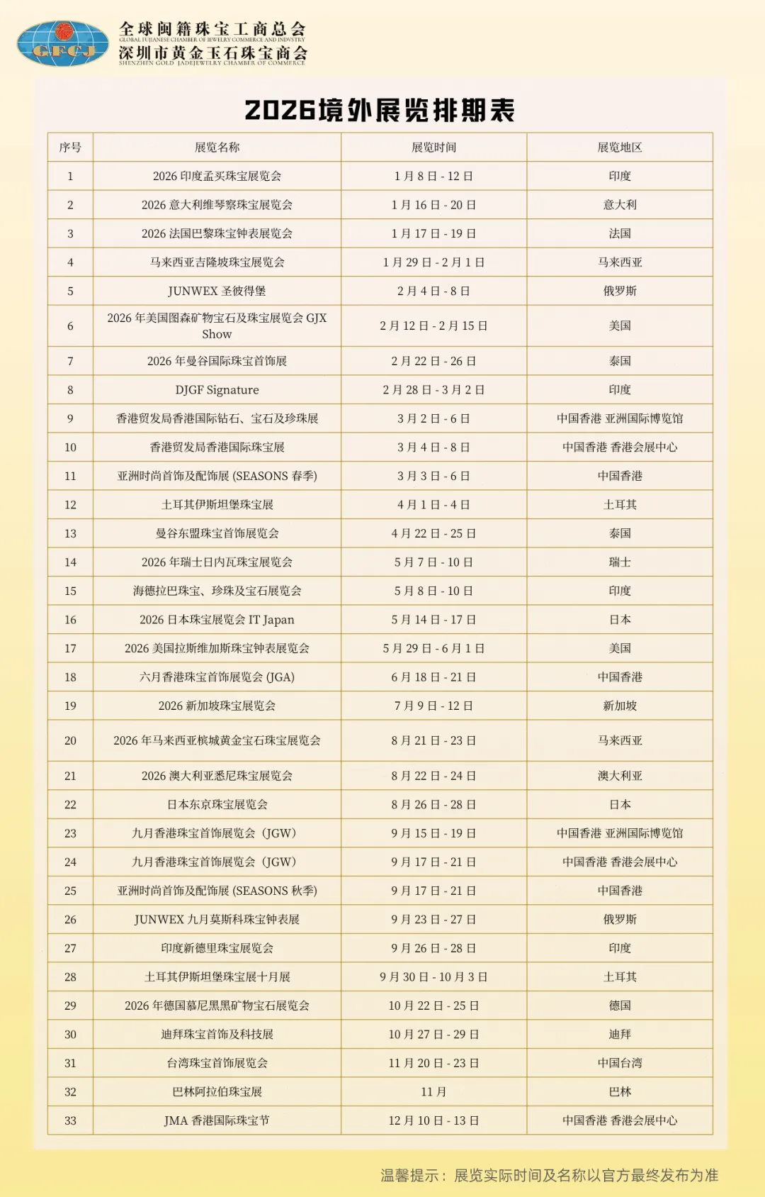 2026 年度境内外重点珠宝展会排期,供广大会员单位参考。