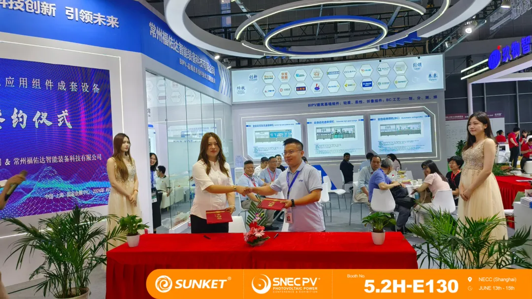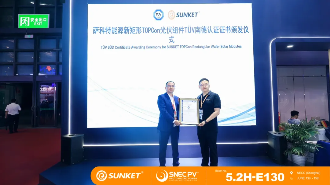 6月13日上午TÜV南德现场为萨科特颁发TOPCon矩形片光伏组件认证证书,这意味着萨科特新能源的TOPCon矩形片组件在性能和安全方面满足TÜV南德技术规范标准要求。同日萨科特与常州福佑达智能装备科技有限公司签订高端定制化应用组件成套设备合作协议,彰显了萨科特新能源稳健的发展态势和卓越的竞争实力。On the morning of June 13, TÜV SÜD issued a certificate for the TOPCon Rectangular Wafer Solar Modules to Sunket, which means that Sunket's TOPCon Rectangular Wafer Solar Modules meet the TÜV SÜD technical specification and standard requirements in terms of performance and safety. On the same day, Sunket signed a cooperation agreement on high-end customized application component complete equipment with Changzhou Fuyouda Intelligent Equipment Technology Co., Ltd., demonstrating SunketNew Energy's steady development momentum and outstanding competitive strength.